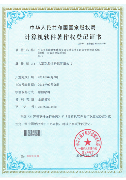 北京歡迎你科技有限公司獲得多項(xiàng)國(guó)家版權(quán)局頒發(fā)的"計(jì)算機(jī)軟件著作權(quán)登記證書",并已獲得“全國(guó)質(zhì)量服務(wù)客戶滿意誠(chéng)信企業(yè)”、“全國(guó)重合同守信用品牌企業(yè)”和“全國(guó)誠(chéng)信經(jīng)營(yíng)示范單位”等榮譽(yù)稱號(hào)。